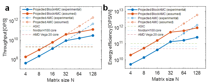 图5 模拟矩阵计算求解的性能比较(计算精度均为FP32精度)。论文链接:https://www.nature.com/articles/s41928-025-01477-0
