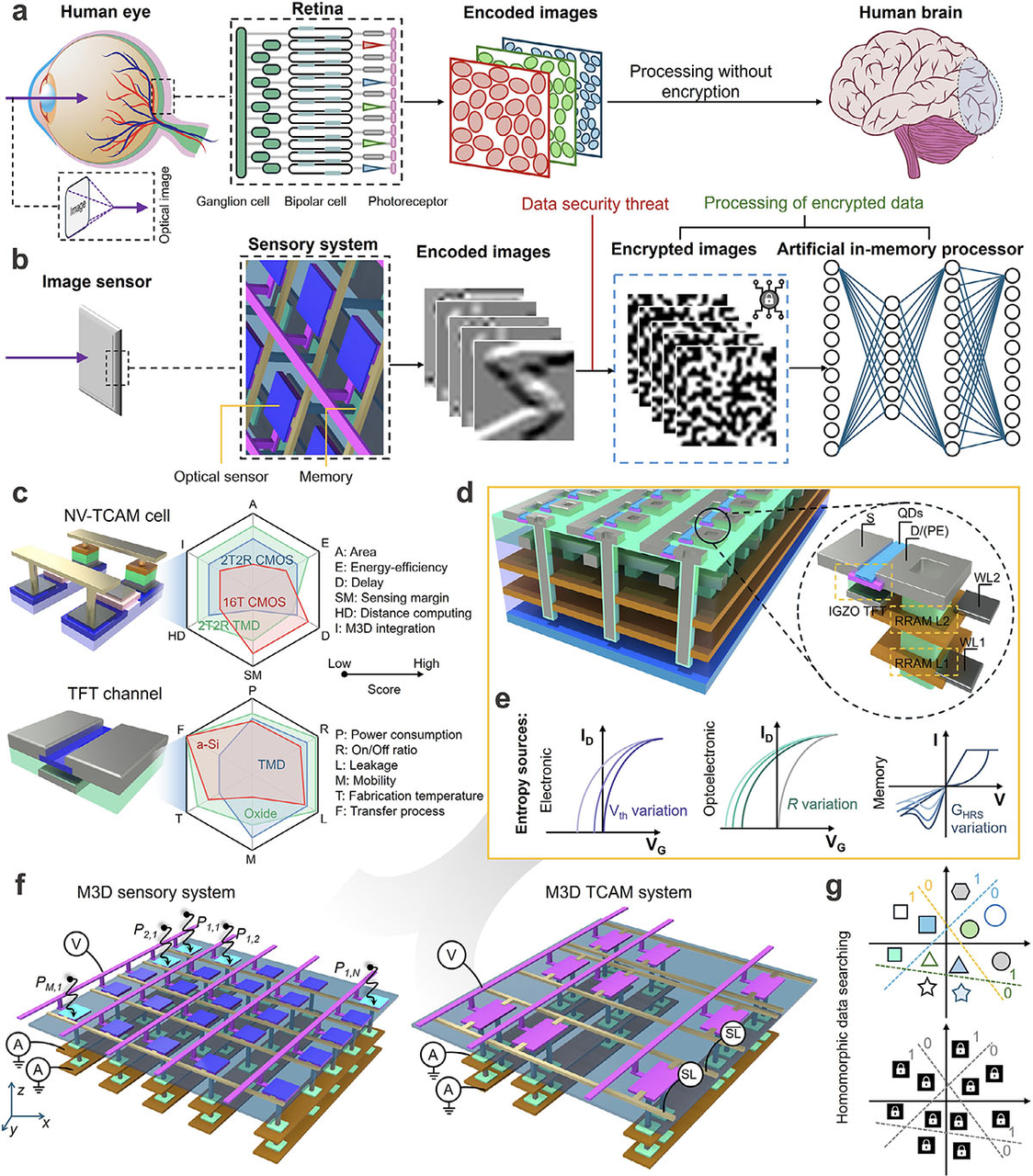 不过,芯片堆叠、低温晶体管制造和阻变存储器领域的技术进步,为重新设计这些功能提供了可能,使其能以紧凑、安全的形式协同工作。近日,一项发表于《先进材料》的研究(《垂直存储器与光电晶体管的单片 3D 集成用于近传感器加密和同态数据搜索》),展示了如何将这些元件整合为单一设备,实现视觉数据在芯片上的直接捕获、存储和加密。