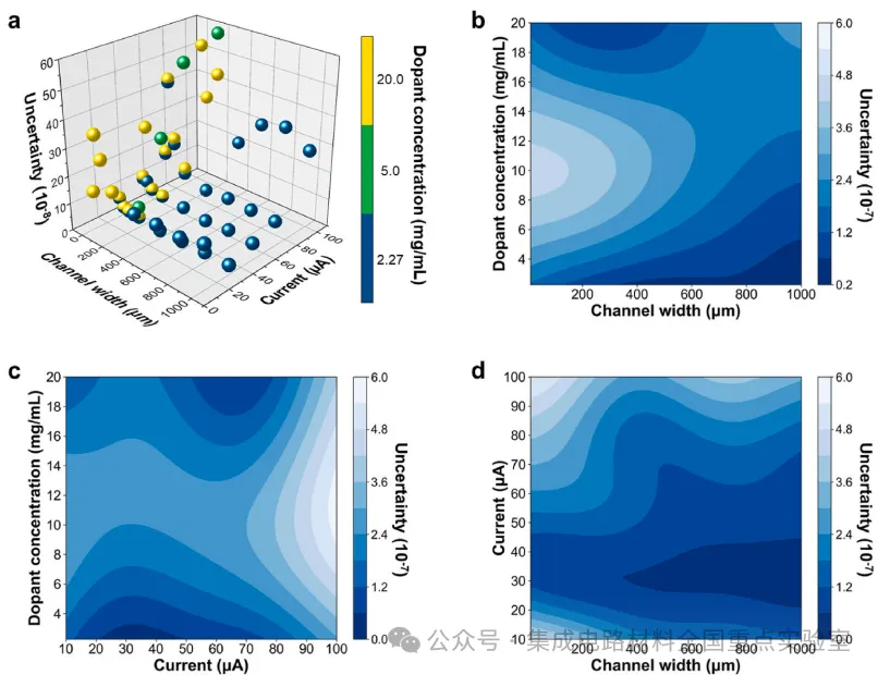 图2 、基于机器学习SVR模型预测的器件不确定度与掺杂浓度、电流、沟道宽度之间的关系图。
