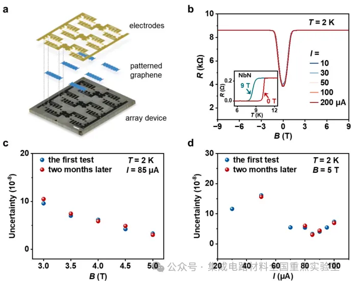 据此成功制备输出量值为8.604 kΩ的量子霍尔电阻阵列,该阵列在约±1.5 T磁场下即可进入量子化平台,并于85 μA电流下达到3.0×10⁻⁸的最低不确定度。该工作揭示了石墨烯量子霍尔器件中载流子密度的显著尺寸依赖效应,为高性能、多量值的量子电阻器件设计提供了关键依据。