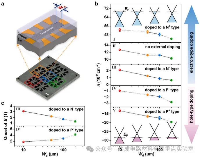 研究团队通过制备不同沟道宽度的石墨烯霍尔器件,并旋涂掺杂剂精确调控载流子类型和密度。测量结果发现石墨烯霍尔器件中的载流子密度随沟道宽度变化呈现规律性差异:在电子掺杂条件下,载流子密度随沟道宽度增加而降低;而在空穴掺杂条件下则相反。这一现象在沟道宽度≤400 μm时尤为明显,直接影响了器件进入量子化霍尔平台所需的磁场阈值。