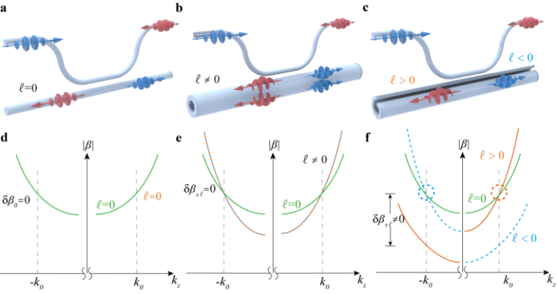 图1 | OAM-momentum locking原理图。a)和d) 常规单模波导不同方向的激发均为单模;b)和e) 普通环形波导不同方向的激发会同时产生不同手性的OAM模式; c)和f) 手性结构下不同方向的激发会选择性激发不同手性的OAM模式。