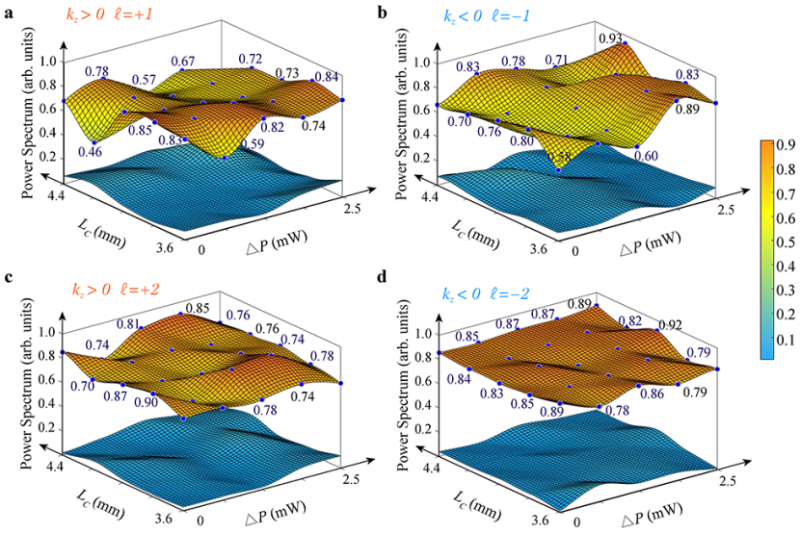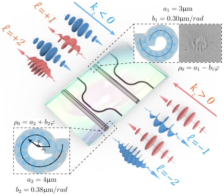 基于第三类手性发射器设计,团队在光子芯片内采用飞秒激光直写制备了截面呈阿基米德螺旋的螺旋波导:对于一阶设计(|ℓ| = 1),螺旋参数设为a₁ = 3 µm、b₁ = 0.30 µm rad⁻¹,实现当光沿+z方向输入时仅输出ℓ = +1涡旋、沿−z方向输入时仅输出ℓ = −1涡旋;而二阶设计(|ℓ| = 2)将参数增至a₂ = 4 µm、b₂ = 0.38 µm rad⁻¹,可在同一芯片内切换产生ℓ = ±2模式。实验通过在器件两端分别注入高斯光并测量输出OAM模式谱验证了OAM–momentum locking效应:正向入射时目标涡旋纯度维持在较高水平,反向入射则以同等纯度产生符号相反的涡旋,非目标模式被抑制至5–10%以下。