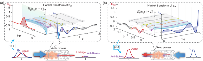 图1. 拉曼量子存储器中的汉克尔时空变换映射关系。(a)写入过程中生成的自旋波空间分布是输入光场的汉克尔谱。(a)读出过程中输出光场的时间波形是自旋波的汉克尔谱。