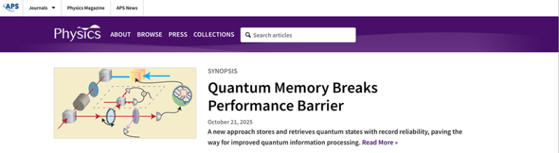 相关研究成果近日以《Near-Perfect Broadband Quantum Memory Enabled by Intelligent Spin-Wave Compaction》为题发表于《物理评论快报》(Physical Review Letters),并被美国物理学会(APS)网站选为“Synopsis”专题报道。