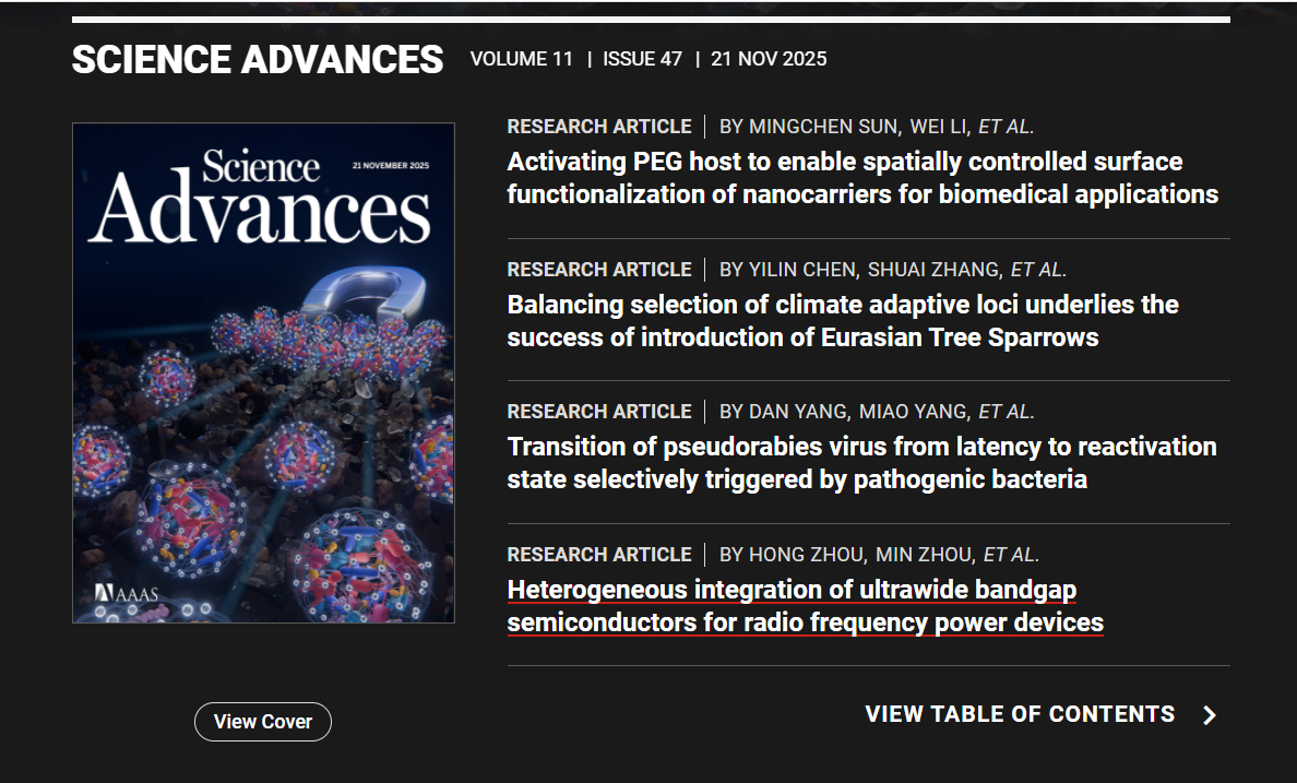 该成果以“Heterogeneous integration of ultrawide bandgap semiconductors for radio frequency power devices”为题,发表于国际顶级综合期刊《Science Advances》(Sci. Adv. 2025, 11, eadw6167 (2025)),并被选为同期封面论文之一。西安电子科技大学为论文第一作者单位和通讯作者单位,第一作者为周弘教授,通讯作者为张进成教授、香港大学张宇昊教授以及西电周敏博士。合作单位包括上海交通大学和美国弗吉尼亚理工大学。此外,前期研究成果入选国际微电子领域顶级会议(IEDM 2023,VLSI 2024),并受邀在国际知名行业杂志《Compound Semiconductor》专栏报道,标志着我校在超宽禁带半导体射频领域的持续原始创新突破并具备国际领先水平。