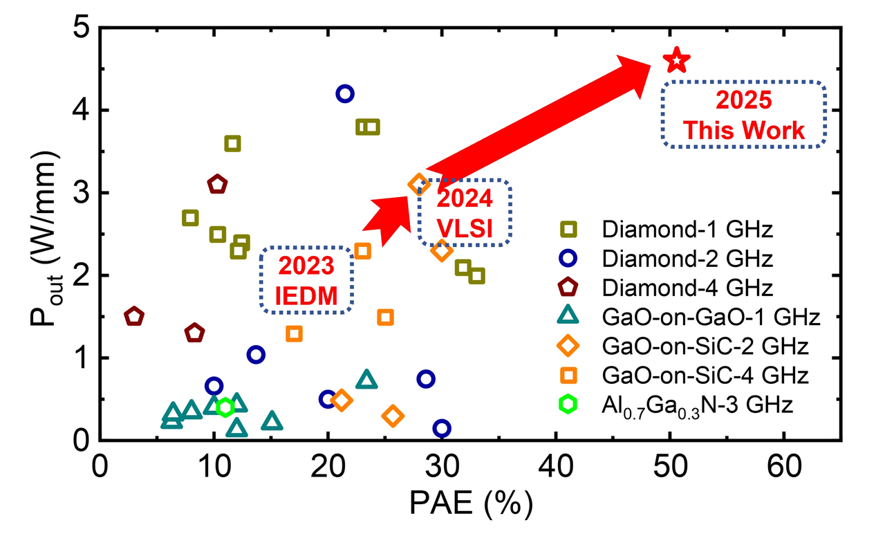 高性能半导体射频器件是通信、雷达、制导、电子对抗等无线电系统的核心。从第一代硅、第二代砷化镓/磷化铟,到第三代宽禁带半导体氮化镓,射频器件持续推动无线通信与雷达技术的跨越发展。近年来,第四代超宽禁带半导体氧化镓因其更宽的禁带、更高的临界击穿场强和高电子饱和速度等优势,被视为下一代高性能射频器件的关键技术方向。然而,氧化镓材料热导率低、电子限域性弱等问题,限制了其射频器件在频率、输出功率和效率方面的表现。