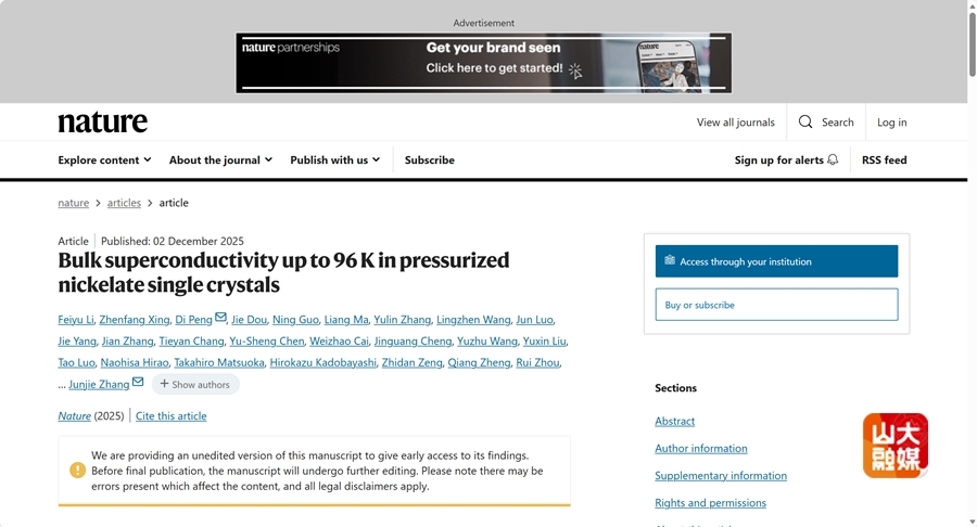 近日,山东大学晶体材料全国重点实验室张俊杰教授/陶绪堂教授团队牵头,联合北京高压研究中心研究员曾桥石、中国科学院物理研究所研究员周睿、国家纳米科学中心研究员郑强、芝加哥大学教授陈愈生等团队,在镍基高温超导体研究中取得新突破,相关团队以“Bulk superconductivity up to 96 K in pressurized nickelate single crystals”为题,在线发表于国际顶级期刊《自然》(Nature)。