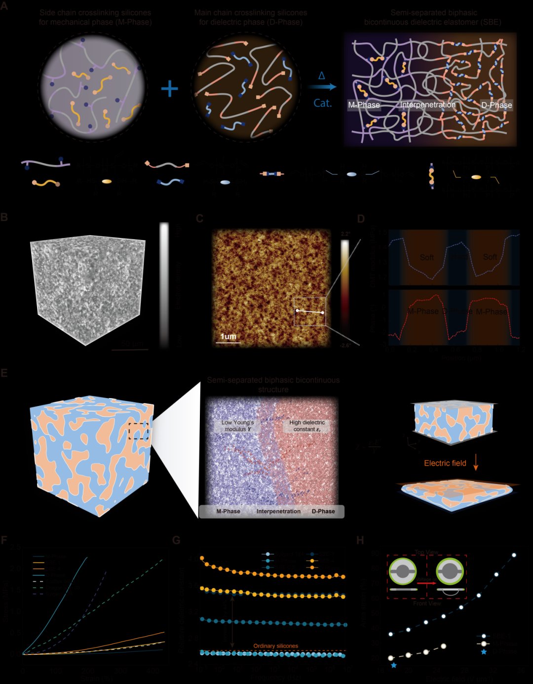 在软体机器人、触觉交互和智能假肢等领域,开发高性能的电作动人工肌肉一直是一项重大挑战。传统介电弹性体材料在低驱动电场下的输出性能长期受限于其有限的机电灵敏度,针对这一难题,该论文提出了一种“异交联诱导相分离”策略,研制出具有半分离双连续相结构的介电弹性体(SBE),将机电灵敏度提升至360 MPa⁻¹,为高性能人工肌肉的发展提供了新途径。