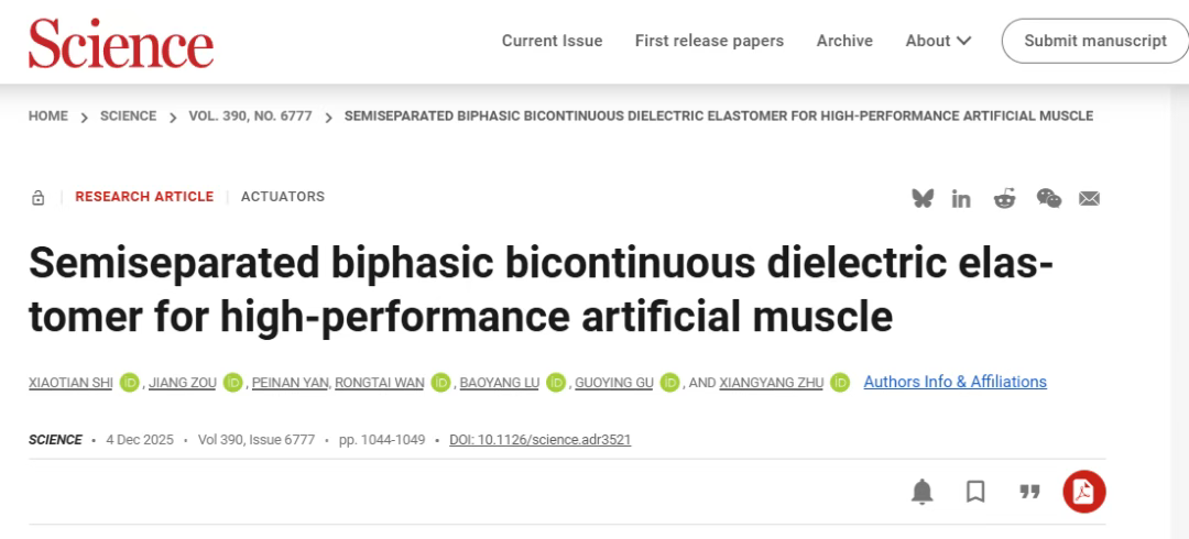 12月5日,上海交通大学机械与动力工程学院机器人研究所朱向阳、谷国迎教授团队的论文“Semiseparated biphasic bicontinuous dielectric elastomer for high-performance artificial muscle”,在线发表于《科学》。