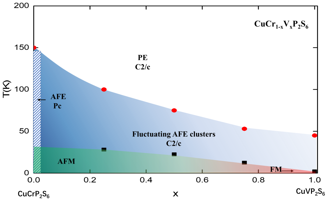 图3 CuCr₁₋ₓVₓP₂S₆的组分-温度下结构与磁电物态相图。