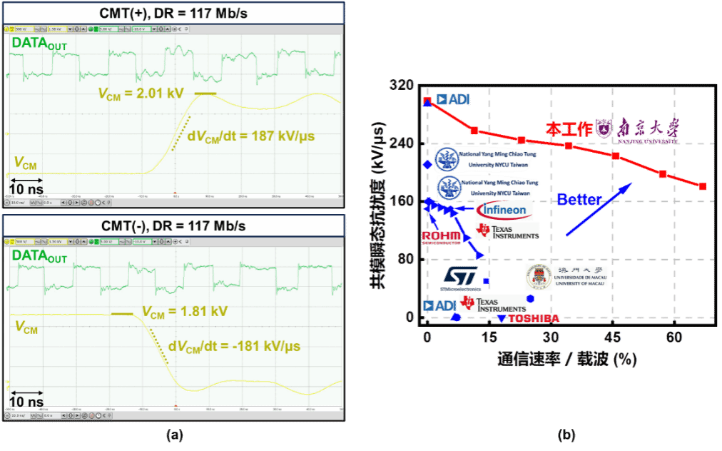 该芯片采用0.18 μm BCD工艺进行了流片验证,实测结果表明,该隔离系统具有高达299 kV/μs的静态CMTI;在181 kV/μs的严重干扰下,仍支持117 Mb/s的高通信速率,误码率低至10-8,支持ns级最小脉冲宽度,相关核心指标与学术界/工业界同类产品相比,均为国际最高水平,可用于机器人、激光器、数据中心供电等领域。