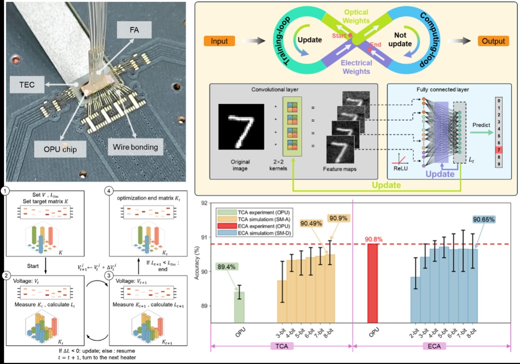 在人工智能神经网络高速发展的背景下,大规模的矩阵运算与频繁的数据迭代给传统电子处理器带来了巨大压力。光电混合计算通过光学处理与电学处理的协同集成,展现出显著的计算性能,然而实际应用受限于训练与推理环节分离、离线权重更新等问题,造成信息熵劣化、计算精度下降,导致推理准确度低。