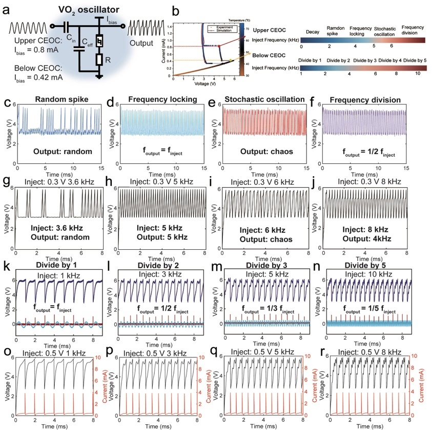团队进一步构建了精确的热力学紧凑模型,首次将材料的物理非线性、电路动力学与信息处理能力统一起来,为忆阻器与神经形态计算的研究开辟了新的理论方向。实验中,研究团队将VO₂器件偏置在“临界混沌边缘”状态,注入不同频率的微小信号,观察到器件可表现出分频、随机脉冲、频率锁定等多种动态模式,这些行为均能通过理论模型精确预测与仿真。