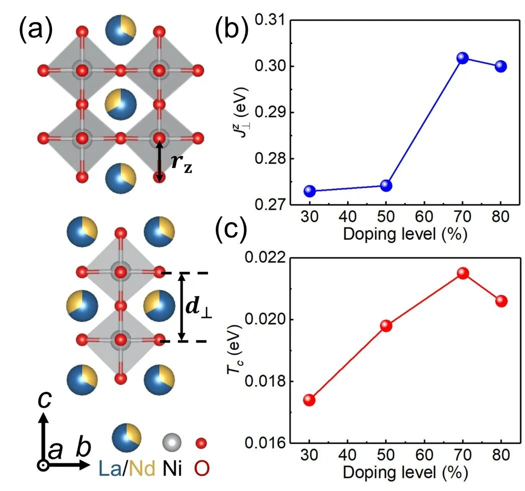 图1:(a)Nd掺杂La3Ni2O7的晶体结构。Nd掺杂La3Ni2O的层间超交换耦合(b)和超导温度(c)随掺杂浓度的变化趋势。