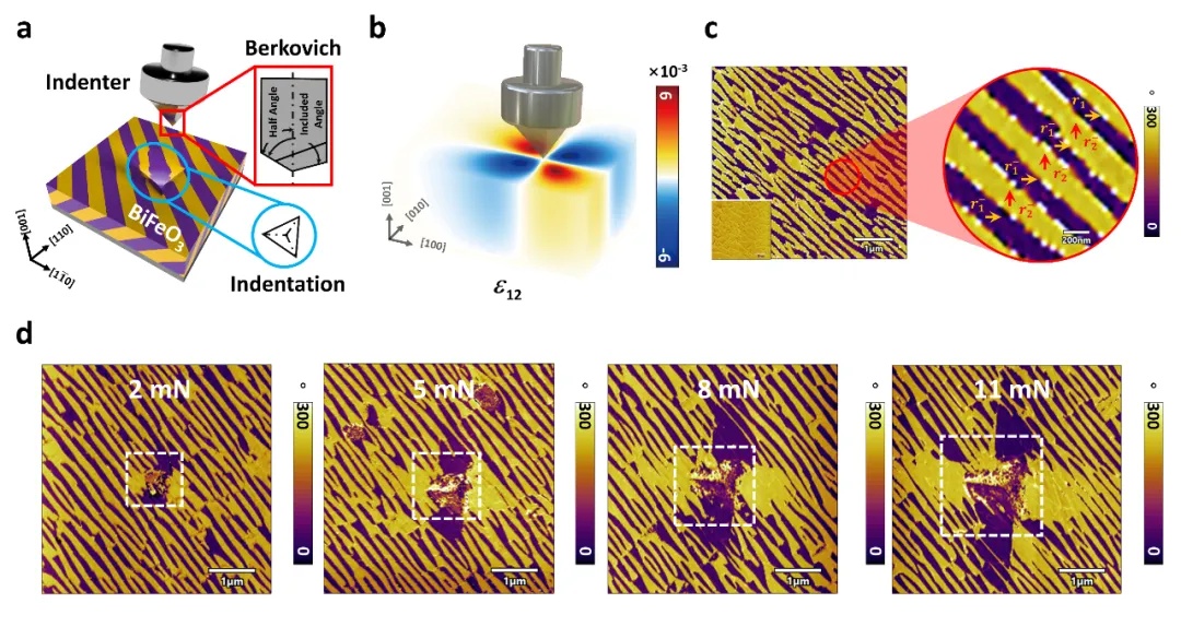 图1. 纳米压痕诱导的“风车状”单畴图案。a, 纳米压痕加载示意图。b, 压痕作用下薄膜中剪切应变分布。c, 压痕前薄膜条纹畴结构。d, “风车状”单畴区域随着压痕载荷的增加从压痕点向外逐渐扩张。