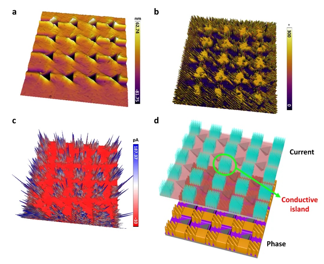 图3. 利用纳米压痕阵列实现畴结构与光电性能的图案化。a, 4×4压痕阵列的形貌图。b, 对应的面内PFM相位图,每个压痕点周围形成风车状单畴,相互连接构成网格。c, 光电流分布图,高光电流被限制在网格包围的“岛屿”内。d, 纳米压痕对BFO薄膜的机械图案化效果示意图。