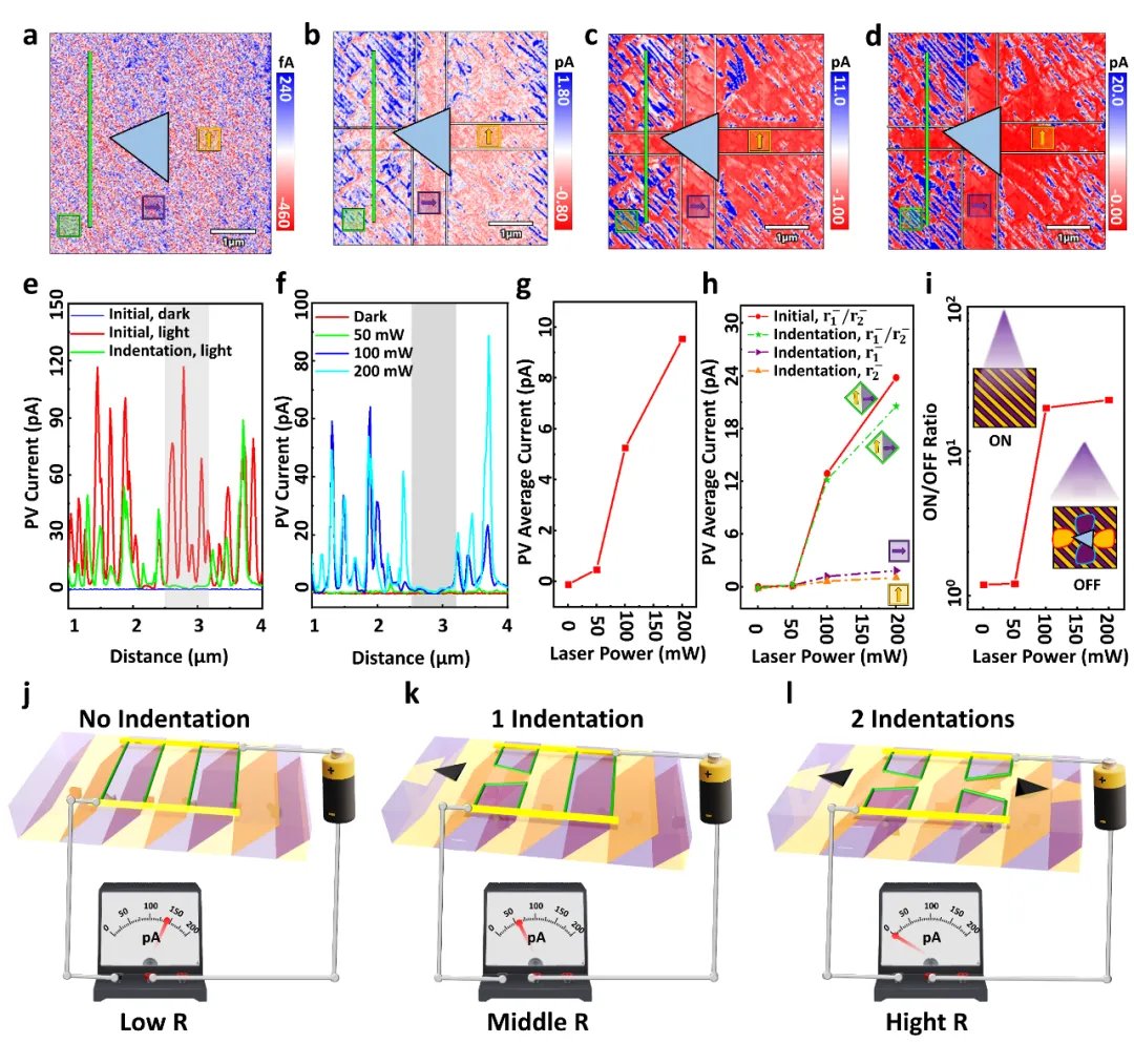 由于压痕引入的局域剪切应变场具有四极对称性,压痕周围会形成独特的、与压头取向无关的稳定“风车状”单畴图案(图1)。该图案的尺寸取决于加载力大小,展现出良好的可调性。尤为重要的是,这种力学畴翻转直接改写了材料的光电响应。实验表明,条纹畴区域(富含畴壁)具有较高的局域光电流,而压痕形成的单畴区域(无畴壁)光电流显著降低,两者之间的开关比超过一个数量级(图2)。这意味着,仅通过纳米压痕这一非电学手段,就能实现光电信号的“开”与“关”,为揭示畴结构调控光电性能的内在机制提供新思路。