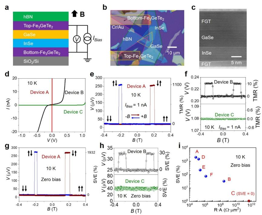 图1 | FGT/p-GaSe/n-InSe/FGT磁性隧道结中的零偏压反常自旋电压效应(SVE)。a.器件结构与测试原理示意图。b.典型器件的光学显微图像。c.截面的高分辨透射电子显微镜图像。d.磁化平行排列下器件A、B、C的I-V曲线。e-f.在1nA偏置电流、10K温度下,器件A、B、C的V-B曲线分别显示出约1100%、10%和0%的隧穿磁电阻效应。g-h.无外加偏压条件下,器件A、B、C在10K温度下的V-B曲线分别显示出约1930%、30%和0%的零偏压反常自旋电压效应。i.在10K温度下,不同器件(标记为A、B、C、D、E、F)的零偏压异常自旋电压效应随电阻-面积乘积的变化关系。