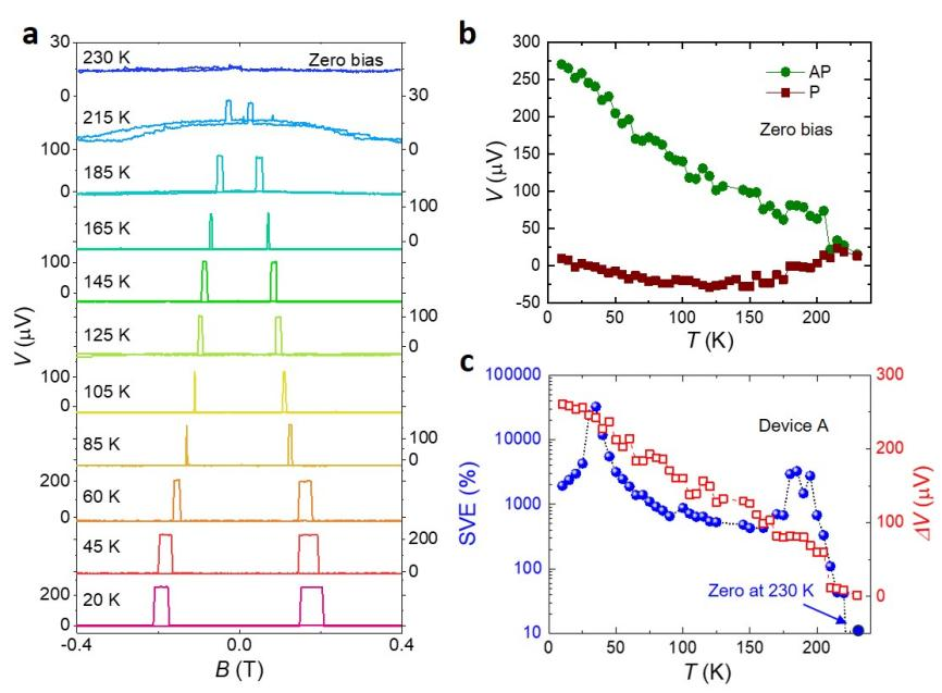 近期,中国科学院半导体研究所半导体芯片物理与技术全国重点实验室王开友研究员团队及其合作者在《自然-通讯》(Nature Communications)发表一项新进展:基于二维半导体p-n结的磁性隧道结,在1nA偏置电流和10K低温下实现1100%的巨大隧穿磁电阻效应(如图1e所示)。该数值与商用CoFeB/MgO基的最高低温隧穿磁电阻(5K下1144%)大小相当。同时,研究团队在该纳米级厚度磁性隧道结中观测到显著的零偏压自旋电压异常效应,类比于隧穿磁电阻效应,自旋电压效应被定义为SVE=|(V(AP)-V(P))/V(P)|。在低温35K下,研究团队观察到零偏压自旋电压信号变化大小比值超过30000%(如图2c所示),这种超大自旋信号来源于自旋向上/向下电子在结区的不对称扩散,由p-n结的内建电场驱动,并在结与环境持续能量交换的过程中产生(如图3所示)。这一发现揭示了转化与放大自旋信息用于低功耗电子器件的全新机遇。