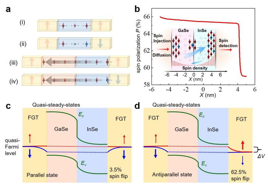 图3 | 磁性隧道结中的自旋极化输运。a.示意图描绘了:(i) 平行状态和(ii) 反平行状态下两个FGT电极之间的单一间隔层;(iii) 平行状态和(iv) 反平行状态下两个FGT电极之间的p-n结间隔层。b.计算得到的GaSe(5 nm)/InSe(5 nm)结中自旋极化率P的分布。插图:引起自旋电压效应的结内自旋密度示意图。c-d.(c)平行状态和(d)反平行状态下FGT/GaSe/InSe/FGT结的能带示意图。虚线表示电子自旋向上(红色)和自旋向下(蓝色)的准费米能级。