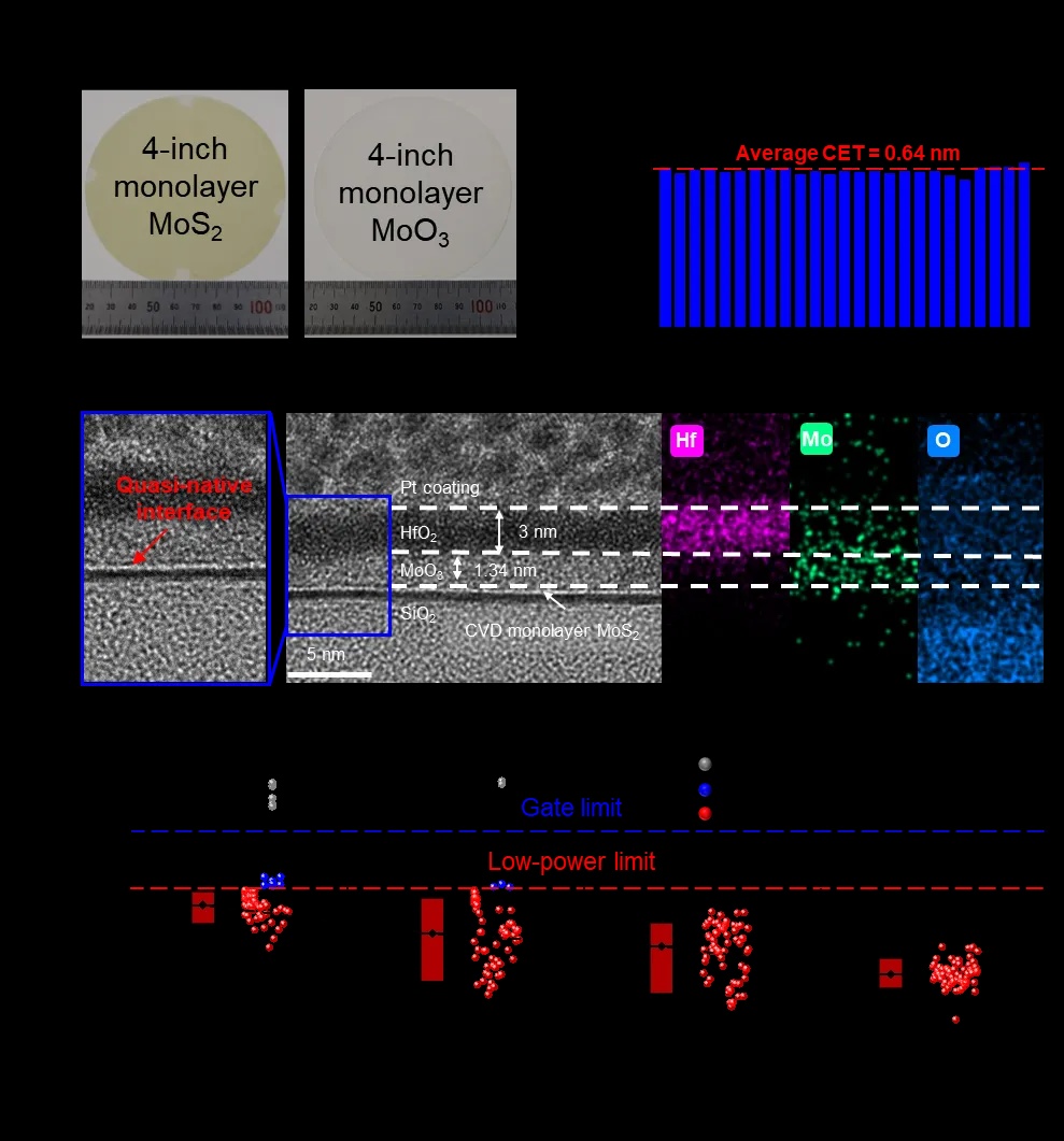 图1(a)晶圆级单层MoS(2)向MoO(3)转化的光学图片;(b)单层MoO(3)的CET统计数据;(c)单层MoO(3)与超薄HfO(2)集成的TEM图;(d)不同CET下MoO(3)/HfO(2)叠层的漏电流密度统计。
