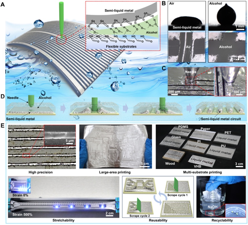 两项成果均基于半液态金属材料的研发与界面调控机制突破,分别解决了柔性电子 “高精度无损耗制造” 与 “三维曲面适配” 两大痛点,覆盖从基础研究、工艺开发到器件应用的全链条创新。