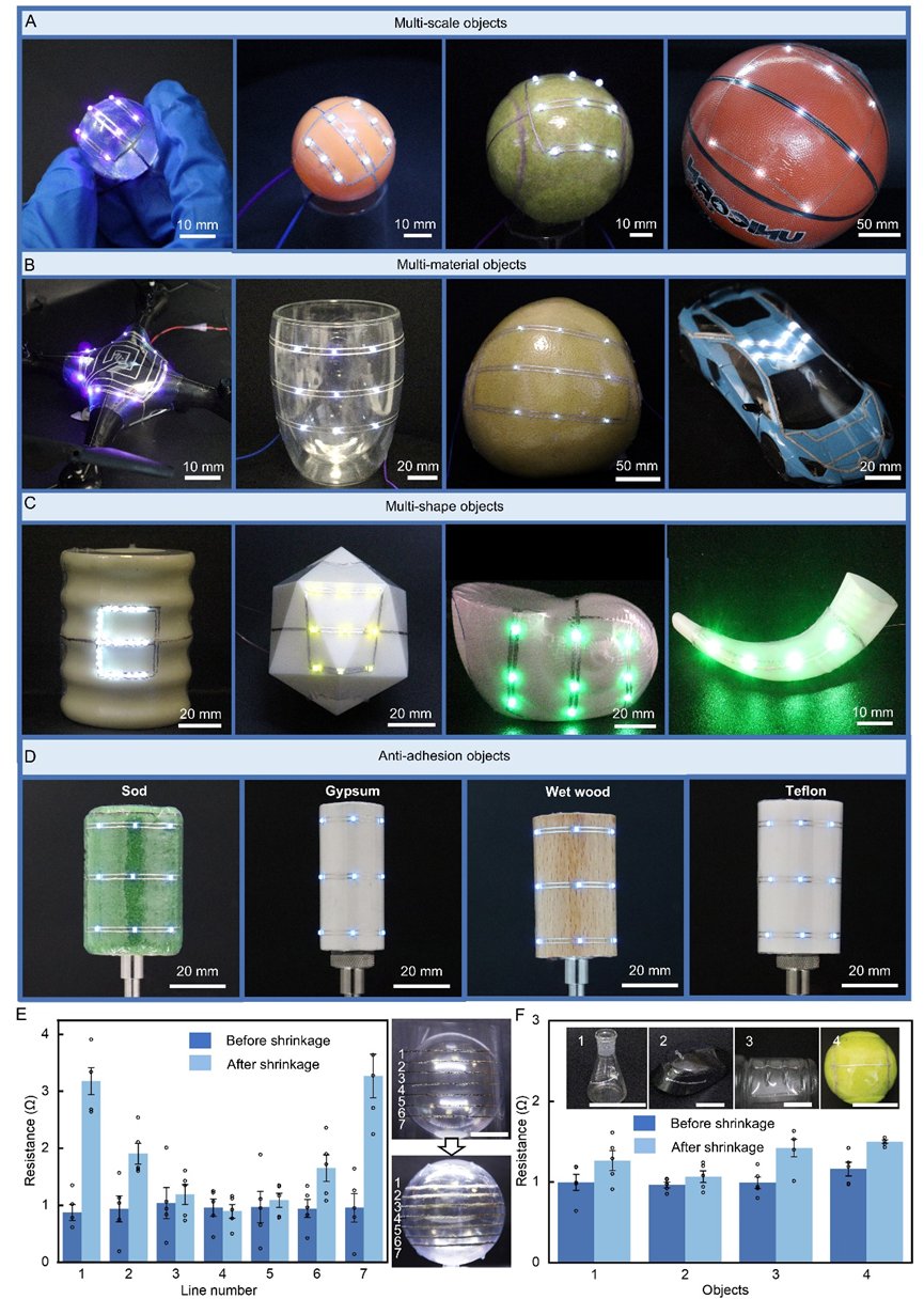 团队还提出了形状自适应共形电子制备技术,攻克了三维曲面电子器件制造难题。团队以热塑性薄膜为自适应基底,通过半液态金属Cu-EGaIn(导电性达9.5×10(6)S m(-1))的选择性粘附图案化,结合有限元仿真辅助电路设计,实现了平面电路向任意三维曲面的高效转化。该技术无需复杂预处理,可在球体、水果、人体皮肤等不同尺度、材质的目标表面稳定贴合,剥离强度远超商用胶带,成功应用于航空航天共形除冰系统、智能医疗绷带、传统设备智能化升级等场景,为 “万物互联” 时代的智能器件低成本制造提供了新范式。