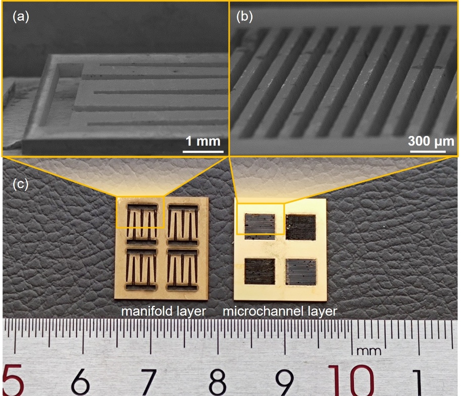 针对这一关键问题,北京大学集成电路学院、微米纳米加工技术全国重点实验室、集成电路高精尖创新中心王玮—张驰团队联合北京遥感设备研究所,北京科技大学相关团队,成功研制了一种全金刚石基嵌入式歧管微通道散热器(FDMMHS),利用激光加工技术在金刚石衬底上实现了高深宽比的微通道与歧管结构的精密制造与集成,确立了“全金刚石-歧管微通道”协同散热的新范式。