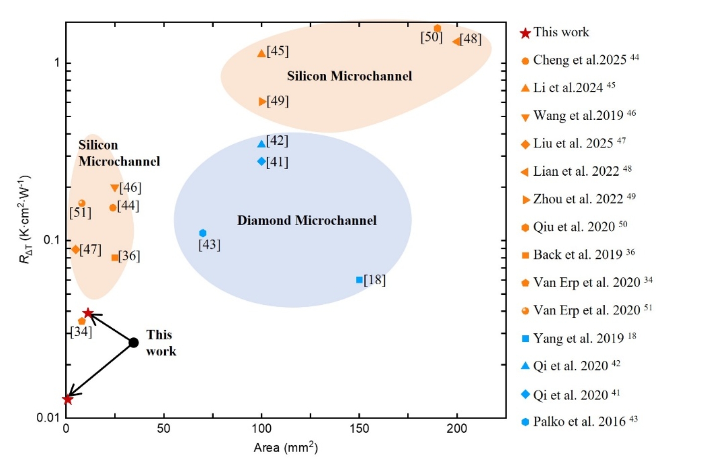 该研究进一步揭示了金刚石材料与歧管微通道架构协同散热的物理机制。研究表明,在处理如GaN HEMT器件微小尺寸的高热流密度热点时,热阻主要由扩散热阻主导。相比于传统的硅基散热器,全金刚石结构极大地降低了扩散热阻,降低幅度超90%,使得热量能够快速扩散至整个微通道区域;同时,结合嵌入式歧管结构带来的流体边界层重构效应,显著强化了对流换热能力。该工作通过实验与理论模型的深度解析,证明了全金刚石微通道技术能够突破传统散热技术的极限,为未来雷达、高能激光器及高功率射频芯片等极端工况下的热管理提供了极具潜力的解决方案。