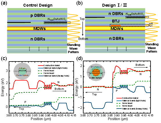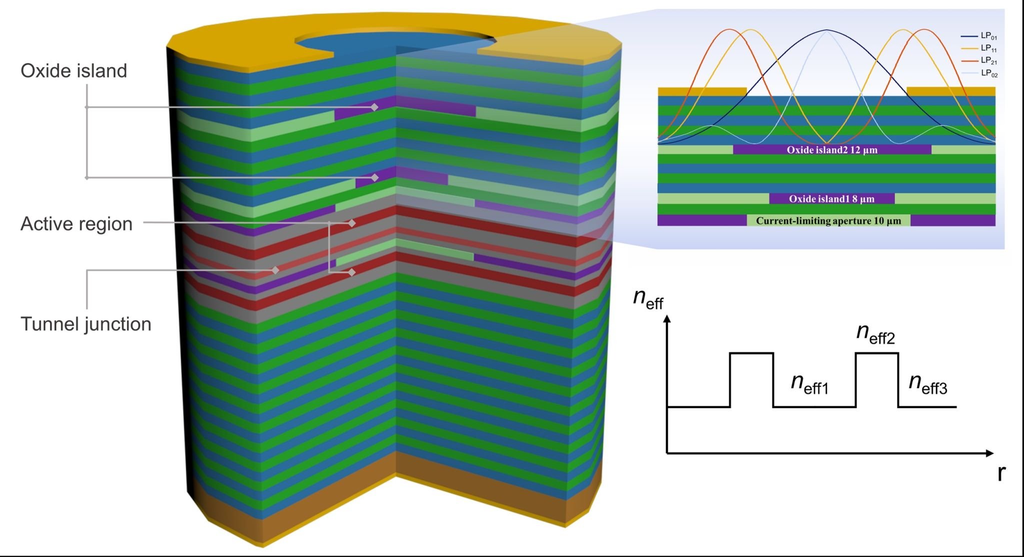目前VCSEL架构方案往往面临功率与带宽不可兼得的困境:提升功率往往导致多模运行、影响远距离传输质量;追求单模则会限制输出功率与调制带宽,难以满足高速互联需求。针对上述瓶颈,团队提出了一种新型VCSEL结构,通过在顶部分布式布拉格反射镜中嵌入两个尺寸不同的氧化物岛,该设计通过增强模式鉴别能力,在较大孔径下仍能维持稳定的单模激射,大幅提升了激光器的输出功率与调制带宽,为AI芯片、空间光通信、数据中心等应用提供解决方案。