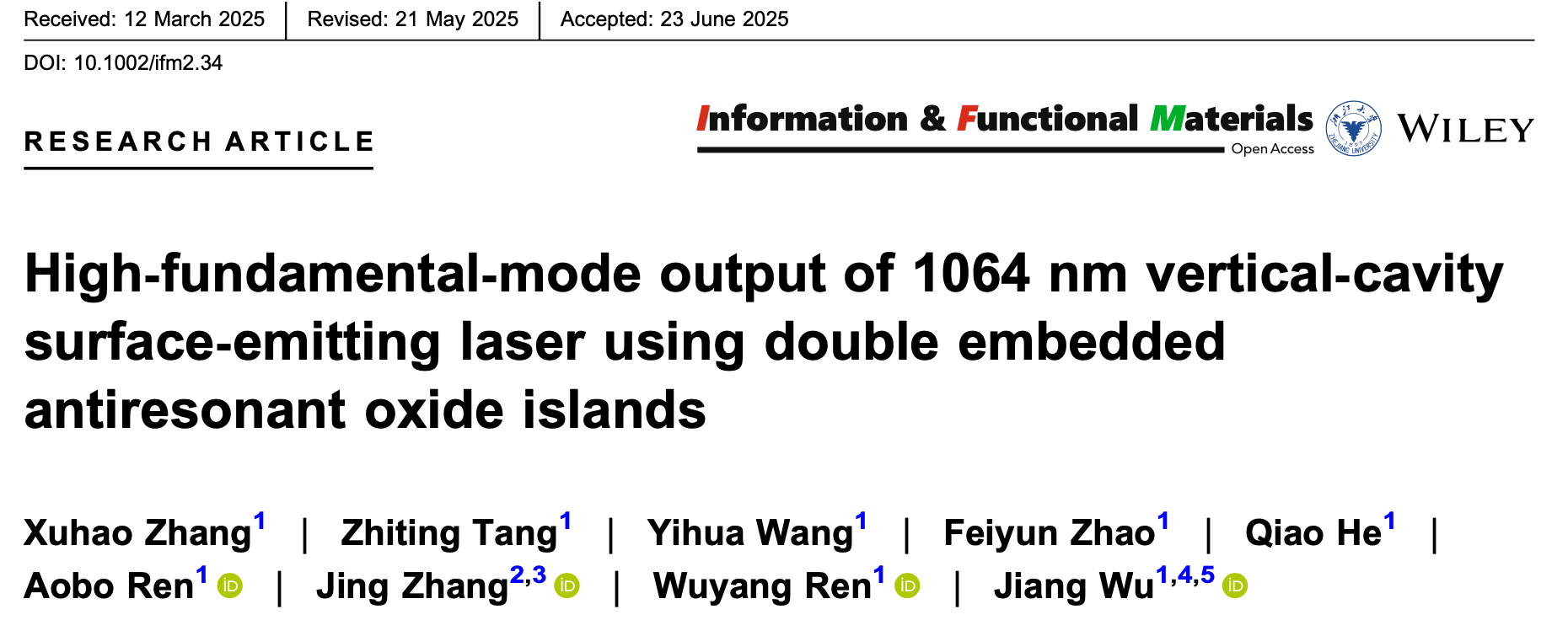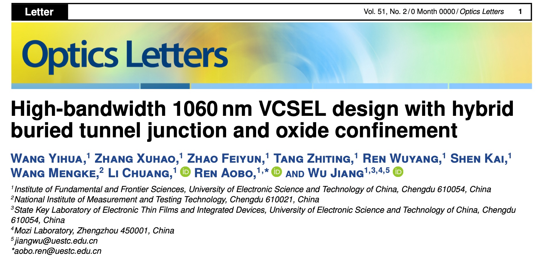 近日,基础与前沿研究院巫江教授、任翱博研究员团队在信息领域中国科技期刊卓越行动计划高起点新刊《Information & Functional Materials》和光学领域国际知名期刊《Optics Letters》上连续发表面向光互联的高功率高速单模1064 nm VCSEL激光光源研究成果。博士生张旭昊和硕士生王艺桦分别为论文第一作者,电子科技大学为第一完成单位。