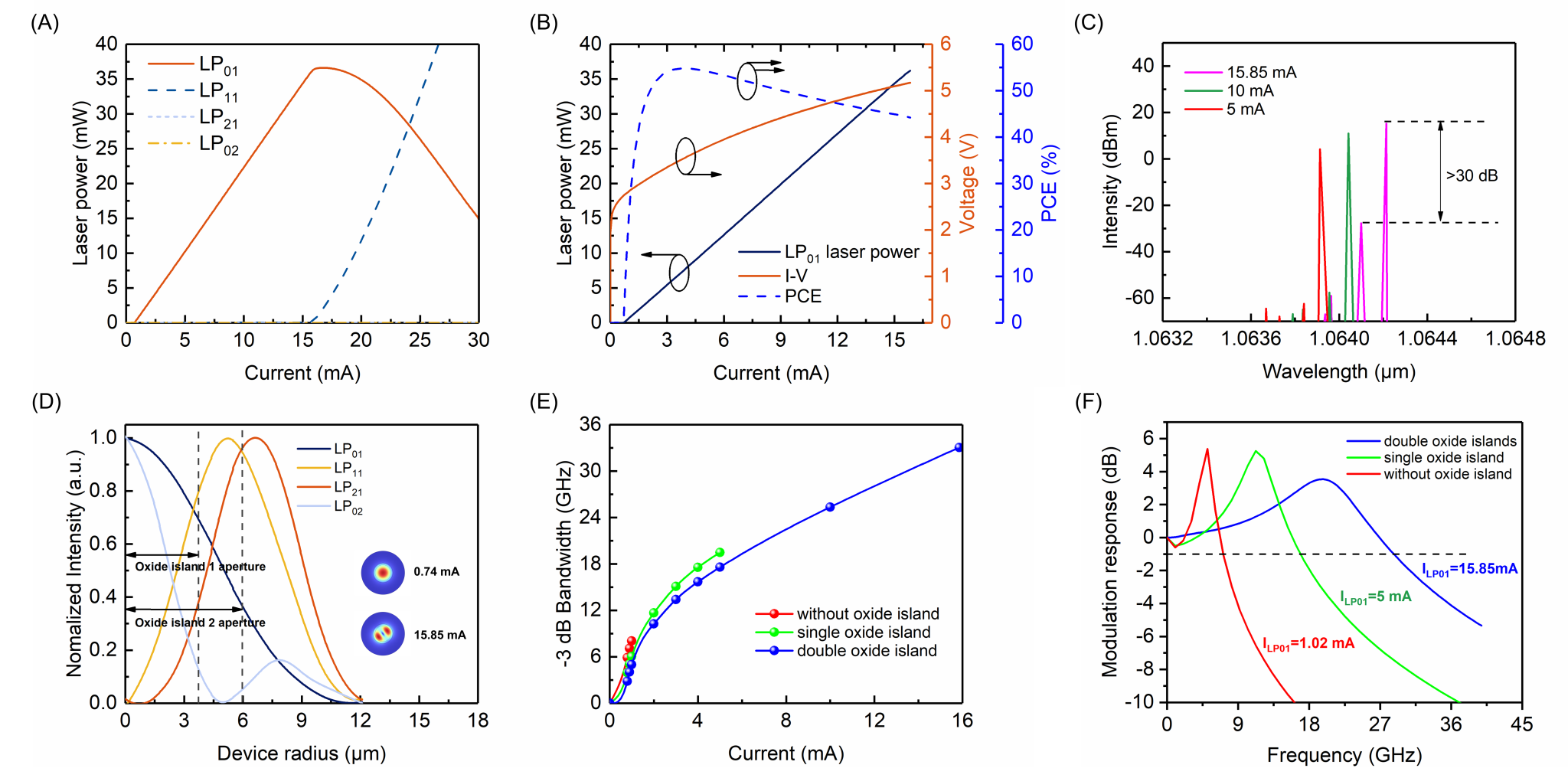 该VCSEL采用双结有源区设计,通过隧道结进行级联提升功率输出。氧化物岛的引入形成了反谐振波导效应。低折射率的氧化物区域与周围高折射率材料构成径向折射率差,不同横模在该结构中的泄漏损耗差异显著。通过优化氧化物岛的位置、尺寸和厚度,综合考虑器件模式控制能力、阈值电流和转换效率,实现了基模与高阶模之间阈值电流的最大化差异。与当前先进设计相比,该结构在1064 nm波长下可实现36.2 mW的单模输出功率,同时边模抑制比大于 30 dB,实现54.8% 的功率转换效率,以及33.06 GHz的3-dB带宽。综合性能显著优于现有方案,进一步推动了自由空间、数据中心等复杂场景的大容量光通信中VCSEL的发展。