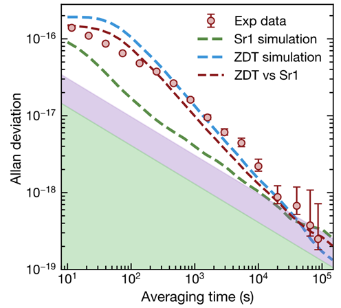 利用基于ZDT的Sr3光钟,中国科大团队进一步将其与稳定性优化的参考光钟(Sr1)进行比对,实现两个完全独立的光钟之间的拍频稳定度可在1万~2万秒进入10⁻¹⁹量级,最佳在2万秒可达2.9×10⁻¹⁹,长期测量结果表明等效天稳可达2.5×10⁻¹⁹,是目前报道的最好的独立光钟比对结果之一。