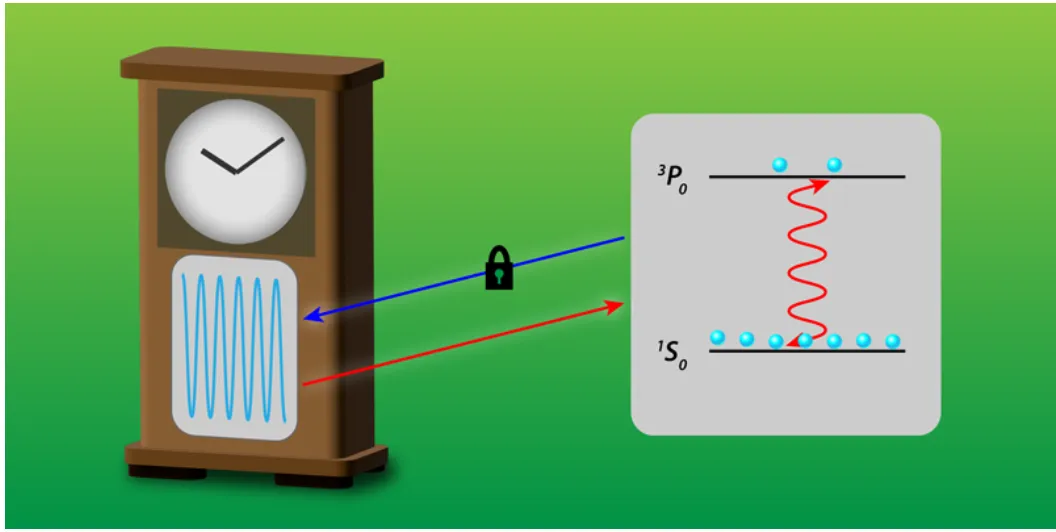 ▲图2 锶原子在¹S₀和³P₀状态之间的跃迁作为光晶格钟的参考。当光信号与跃迁共振时,其频率可以被非常精确地界定。