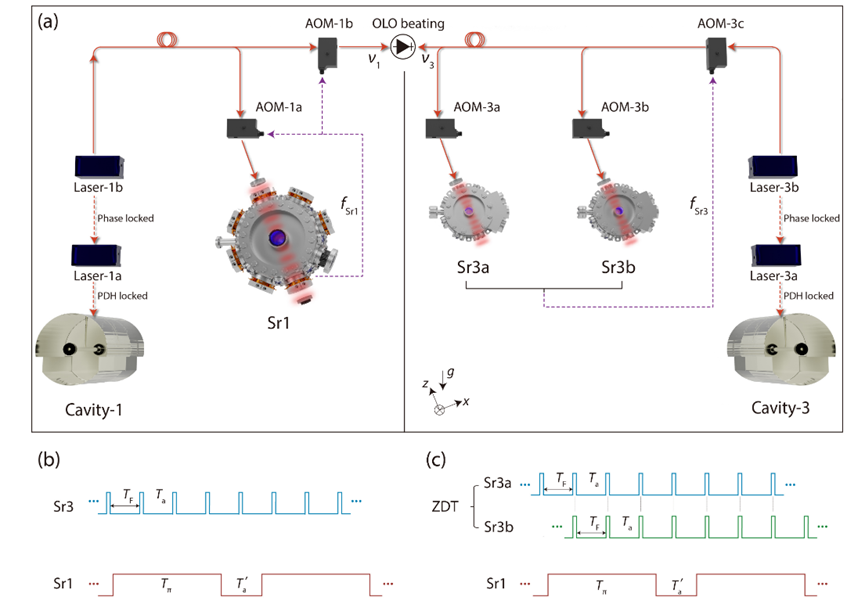 面对这一问题,中国科大团队设计了一个全新的高性能双原子系统光钟(Sr3)。这个双原子光钟内包含了两个锶原子光晶格(Sr3a和Sr3b),在Sr3a光钟进行原子制备的时间内,Sr3b光钟进行原子跃迁探测;而当Sr3a光钟开始进行原子跃迁探测的时候,Sr3b光钟开始进入下一轮原子制备。Sr3光钟通过交替探询两个锶原子光晶格(Sr3a和Sr3b),从而实现无死时间(Zero Dead Time, ZDT)光钟运行方案。