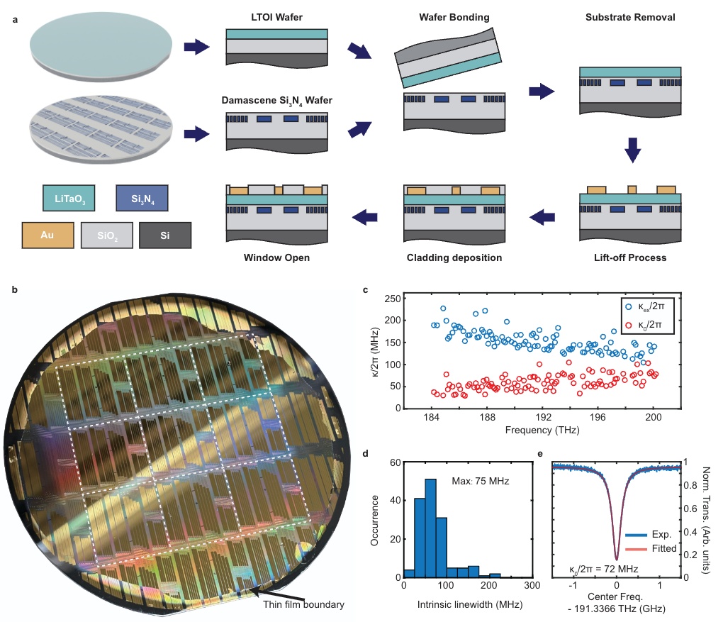 依托研究团队开发的氮化硅光子大马士革工艺与晶圆键合技术,本工作实现了4英寸 LT-on-Si3N4异质晶圆。如图1b所示,在深紫外光刻(DUV)定义的 9 个主要写场中,大规模转移的钽酸锂薄膜完整率接近 100%。通过微环型谐振器表征可知,该异质混合波导的光损耗约14.2 dB/m,该值显著优于同类型集成方案。