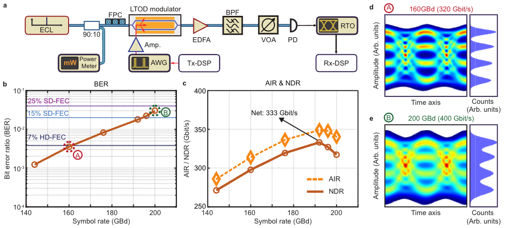 在高速信号传输实验中,研究团队使用PAM4 信号编码在 144–200 GBd 范围对强度调制器进行测试,并基于 GMI/NGMI 评估可实现的净数据传输速率,其中192 GBd PAM4 对应净速率最高 333 Gbit/s。进一步地,该异质平台也支持相干IQ调制,对应的相干光调制器由两条MZM 组成,通过热光移相器获得可长时间稳定的90° 相位差,并利用两个调制通道完成QPSK/16QAM等信号格式的传输演示,最终可实现的最高净速率达到 581 Gbit/s。上述指标刷新了同类平台的最高信号传输速率记录。