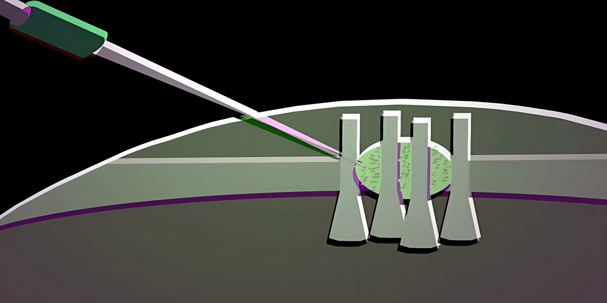 该器件核心为一颗球形液晶微珠,依靠材料弹性与分子间作用力维持形态,内部掺入荧光染料,并被四个直立锥形聚合物结构夹持,用于引导光进出器件。当激光脉冲通过四条聚合物波导中的一条射入时,光线会迅速传入液晶,激发荧光染料。在回音壁模式共振效应下,液晶内部的光子每次撞击球形界面都会被反射回内部,最终在腔内循环,直至被反射至某条波导,并以激光束形式射出。