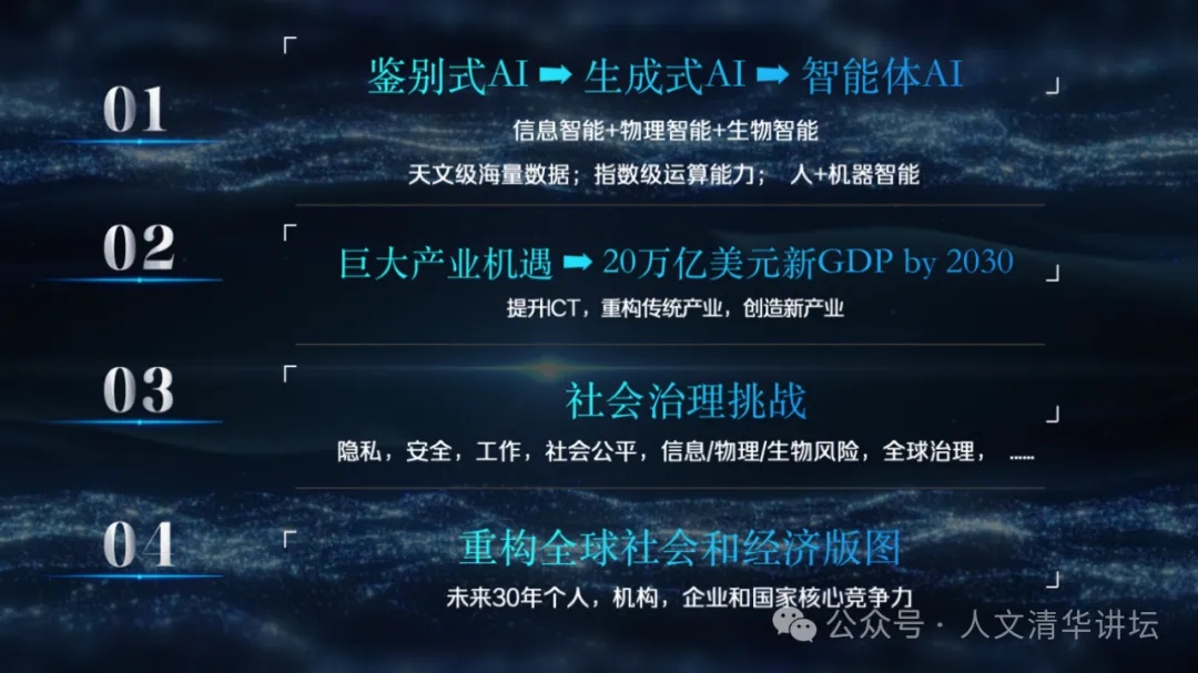 当前,人工智能正从鉴别式AI走向生成式AI,并逐步迈向智能体AI。新一轮人工智能是信息智能、物理智能和生物智能的融合,是原子、比特和分子的融合,是碳基生命和硅基世界的融合。在这一进程中,我们拥有天文级海量数据、指数级运算能力,更重要的是人与机器将协同进化,催生巨大的产业机遇——达沃斯AI理事会预测,到 2030 年,人工智能带来的新机遇将创造20万亿美元的经济价值,超过当前许多国家的GDP总量。同时,我们也面临着隐私保护、安全保障、就业转型、社会公平、风险治理等一系列社会挑战,人工智能将重构全球社会、经济版图。