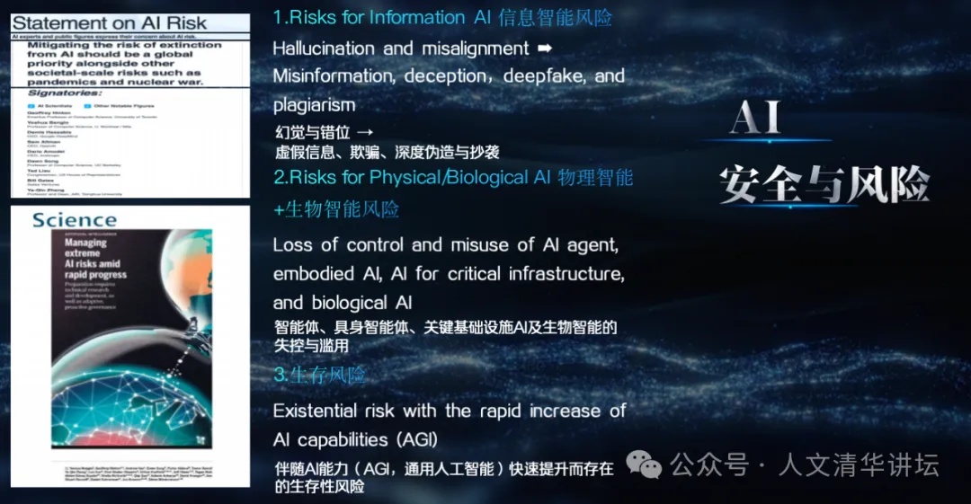 这个风险有几个层面:首先是信息智能领域的风险,我们已经看到了,它可以生成虚假信息,它可以进行深度伪造,有的时候它还会产生幻觉,还可以用来欺骗他人,另外还有版权归属的问题。我们现在使用的互联网信息,从上个月开始,已经有 50% 以上的信息是人工智能所产生的。这个时候我们怎么防范这些风险?比如现在有很多不实的信息,这些不实信息又被用来训练新的大模型,然后生成更多的不实信息,形成恶性循环。我们怎么解决这些问题?需要从技术、政策、法规方面共同努力来解决这些问题,不过这个领域的风险我认为还是可控的。