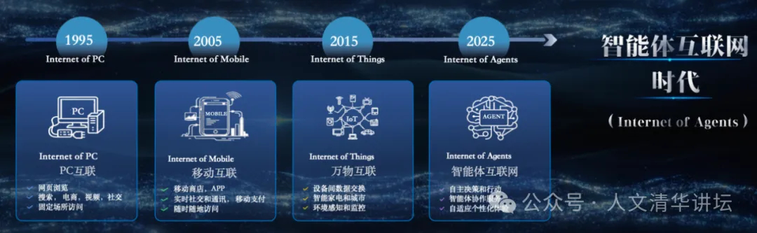 另外一个角度看我们的产业发展,是从互联网的发展脉络来看。1995年开启了PC互联网时代,2005 年开启了移动互联网时代,2015年开启了物联网时代,也就是万物互联的时代。现在我认为,我们进入了一个新的时代,就是智能体互联网时代,也就是Internet of Agents。这里面有一个特别有意思的概念,叫做Agent Swarm(智能体群)。