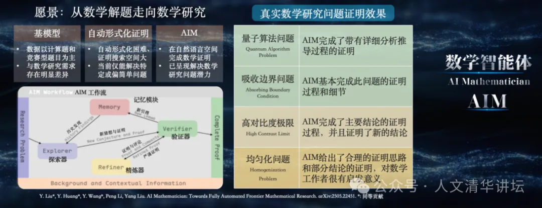 AIR李鹏老师团队与清华大学丘成桐先生的数学研究院合作,研发了数学智能体AIM。它能够分解任务,完成定理证明。例如在材料科学、分子动力学领域的重要难题“均匀化问题”的证明中,AIM形成了17页的证明文档,其中绿色部分完全由机器生成,橙色部分主要由机器证明后经人工校正,蓝色部分为人工完成,黑色部分是问题描述。这是人机协作的绝佳范例,据数学老师反馈,证明中最难的部分由AI完成。