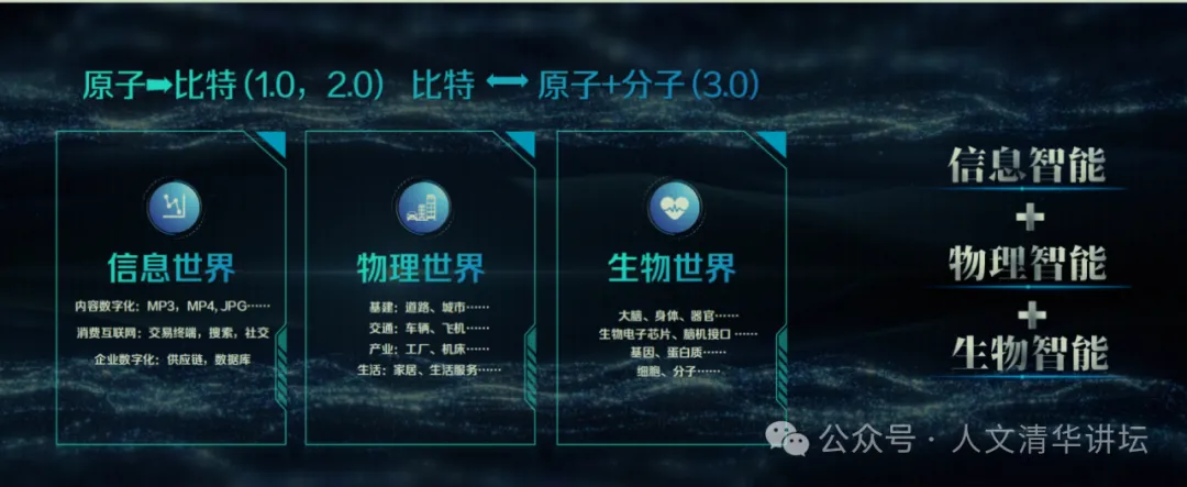 MIT媒体实验室主任曾在数字化1.0开启时提出,我们正在从 “原子” 走向 “比特”。“比特”是香农所定义的数字世界的基本单位。而如今,我们正从比特回归原子、走向分子——新一代智能是信息智能、物理智能和生物智能的融合,是比特、原子和分子的融合,也是碳基生命和硅基世界的融合。