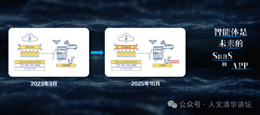 2023年3月,我绘制了人工智能时代的架构图:以前沿基座大模型为操作系统,上层涵盖行业垂直系统、SaaS 应用软件,端侧(手机、PC)则通过大模型蒸馏或压缩后的小模型运行 APP。到 2025年10月,我对这一架构进行了更新,核心变化是将SaaS和APP替换为智能体——我认为智能体是未来的SaaS,也是未来的APP。虽然短期内手机APP仍是主流,但智能体功能将逐步融入其中。