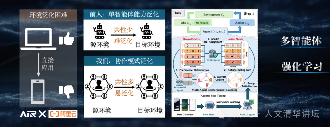 詹仙园老师团队研发的X-VLA系统,尝试解决智能体的泛化问题。传统机器人学会一项技能后,难以迁移到其他机器人或不同场景。而X-VLA 系统仅需9亿个参数,就能部署到不同机械臂和机器人上,实现技能的跨设备、跨场景迁移。比如机械臂学会叠衣服后,更换不同机械臂、调整桌子高度,仍能完成叠衣服任务,还能将相关技能迁移到做家务等其他场景,完全通过自主学习适应环境。