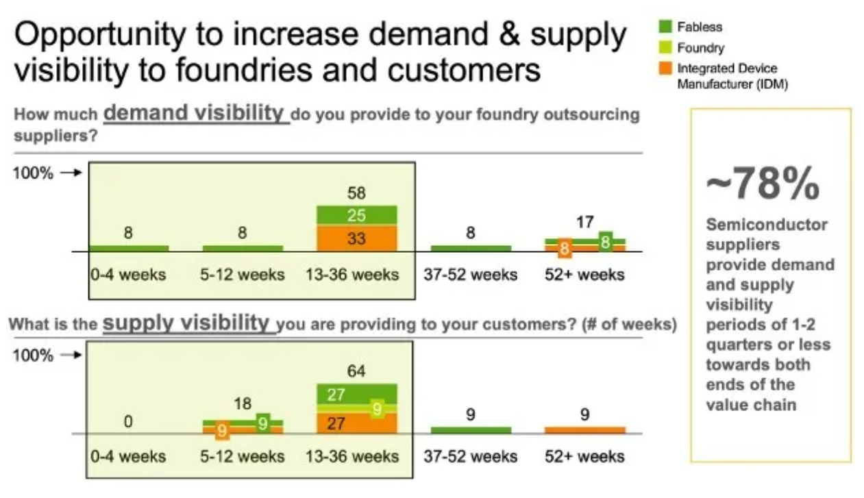图3:大多数晶圆代工厂、无晶圆厂设备制造商和集成设备制造商提供1到2个季度或更少的供需可见性。来源:SEMI半导体短缺调查,2022年春季
