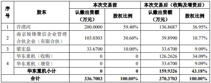 公告显示,华东重机拟以不超过人民币3亿元的投前估值收购锐信图芯股权并增资,即以不超过1.125亿元向许清河、锐锋聚信收购其持有的锐信图芯合计37.50%股权(对应注册资本126.2626万元),并以不超过3000万元认购锐信图芯新增的注册资本33.67万元(以下简称“本次交易”)。据了解,许清河系锐信图芯的创始人兼股东,他还控制锐锋聚信。