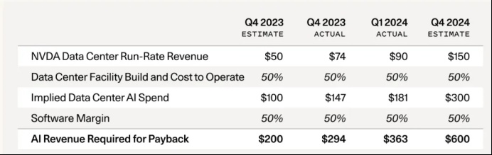 在去年9月份的文章中,作者David Cahn(红杉资本的合伙人)表示:在 GPU 上每花费 1 美元,在数据中心运行 GPU 需要花费大约 1 美元的能源成本。GPU 的最终用户——例如星巴克、X、特斯拉、Github Copilot 或新的初创公司——也需要赚取利润。假设他们需要赚取 50% 的利润,而英伟达2023年底的run-rate GPU revenue是500亿美元(当时分析师的估计),那么这些 GPU 需要产生 2000亿美元的生命周期收入来偿还前期资本投资(2023年9月算出的数字)。这还不包括云供应商的任何利润——他们要获得正回报,总收入要求会更高。