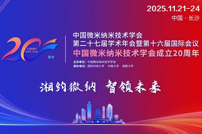 中国微米纳米技术学会第二十七届学术年会暨第十六届国际会议(简称CSMNT2025)定于2025年11月21-24日在长沙市召开。本届会议由中国微米纳米技术学会(简称学会)主办,国防科技大学(年会部分)、中南大学和湖南大学联合承办,清华大学精密仪器系、机电动态控制重点实验室、湖南省传感器产业促进会和中国电子科技集团公司第四十八研究所参与协办。会议以“湘约微纳•智领未来”为主题,聚焦微米纳米及相关领域的最新研究成果、技术创新及产业应用,通过异彩纷呈的活动搭建全方位、多角度的交流平台和学术体验场景。